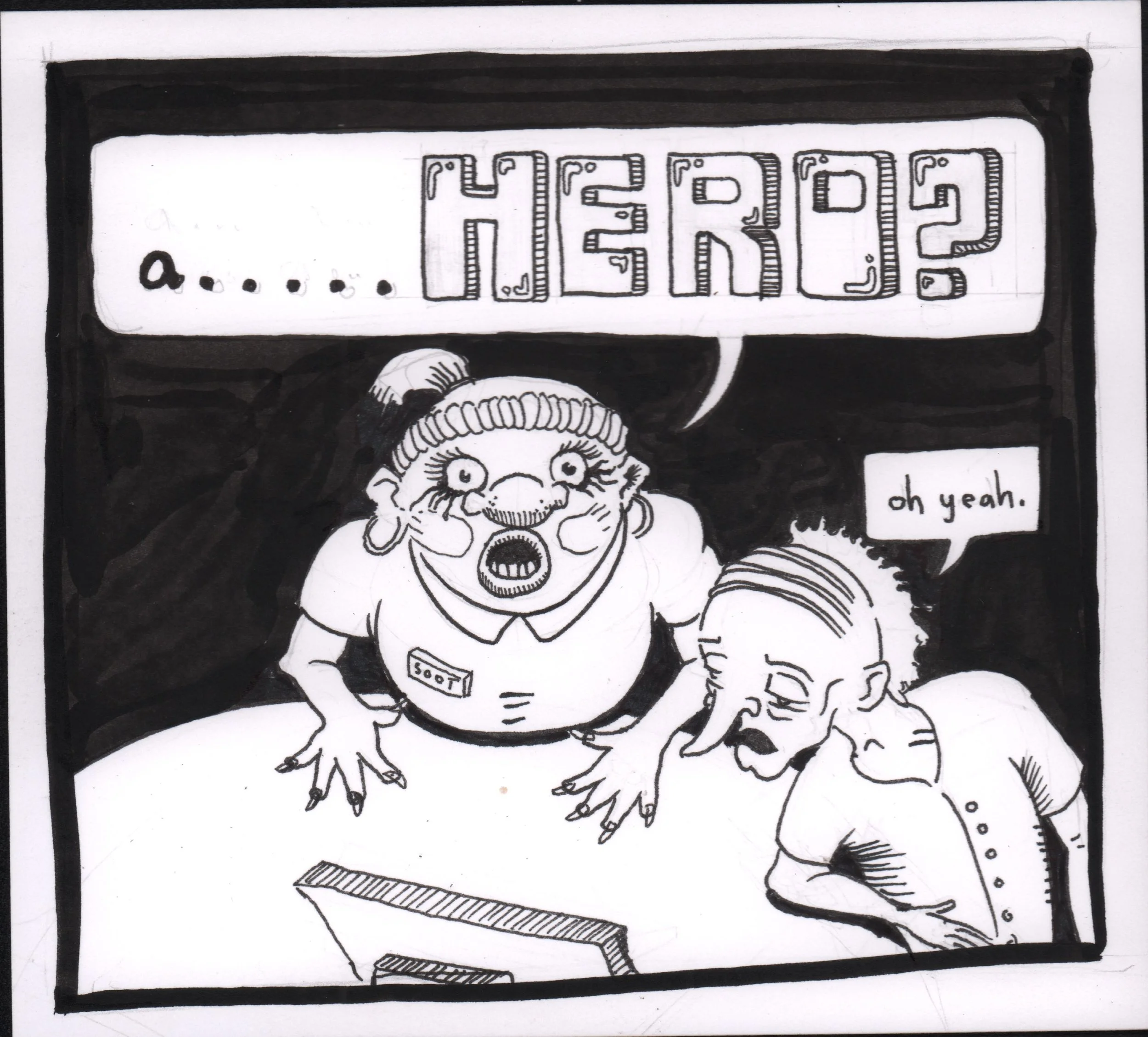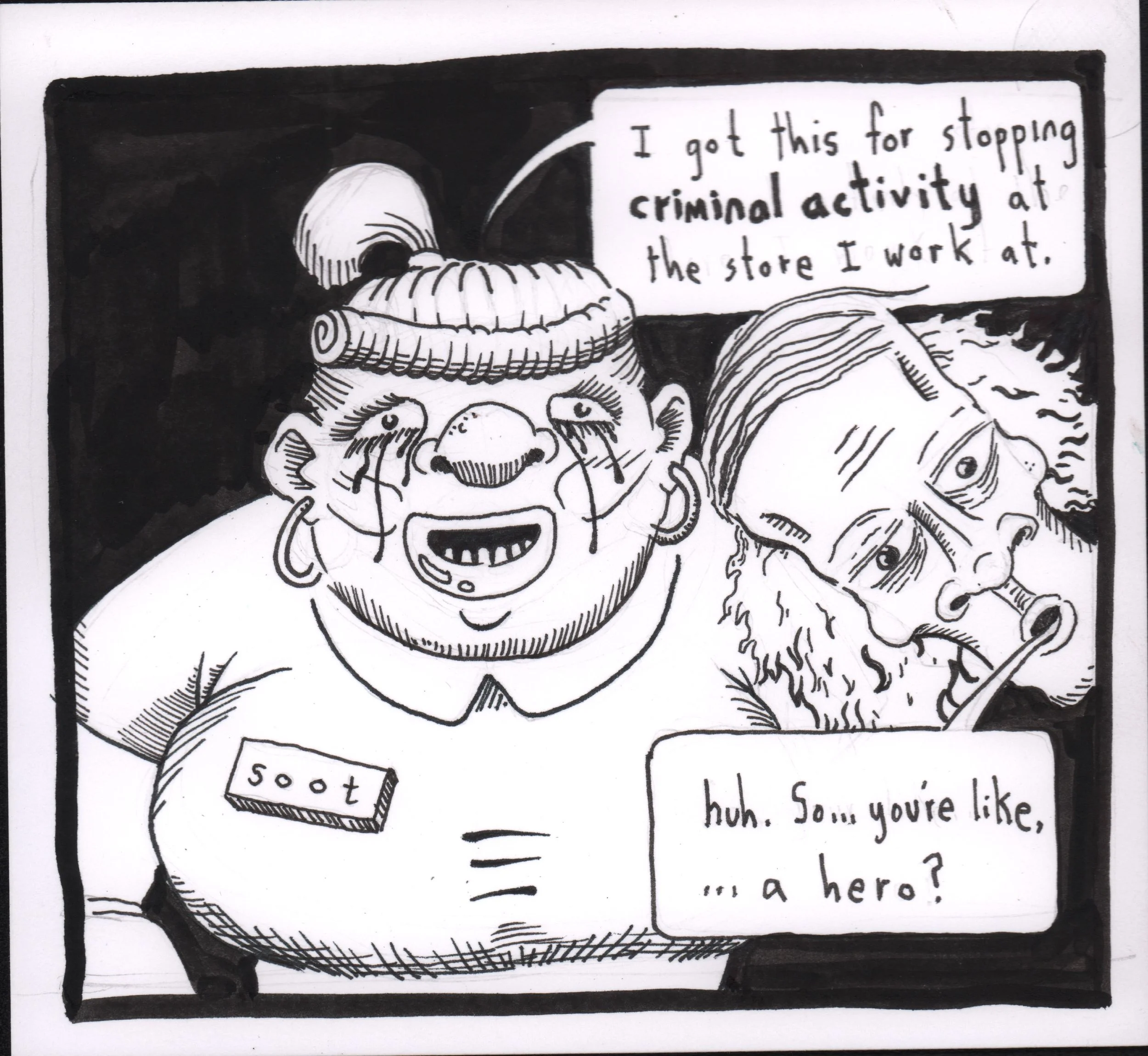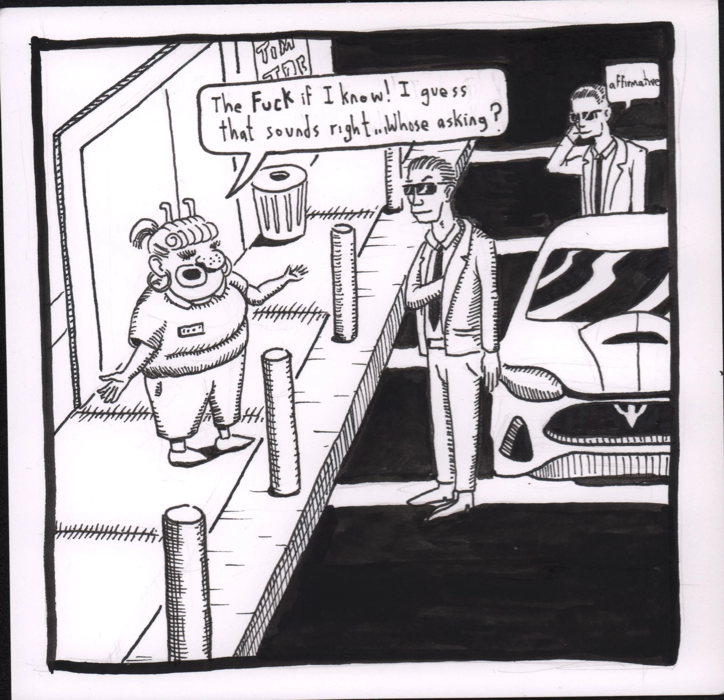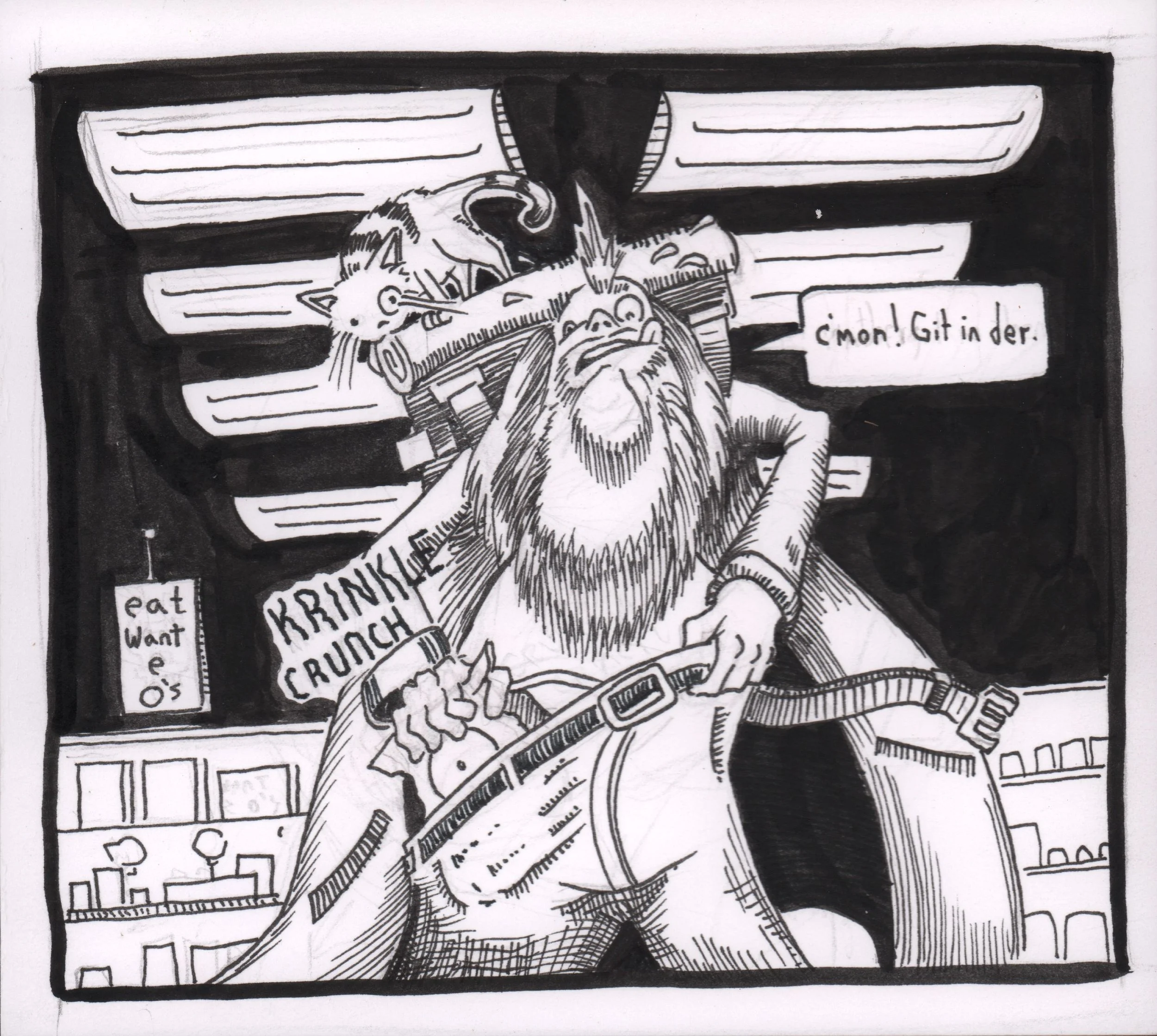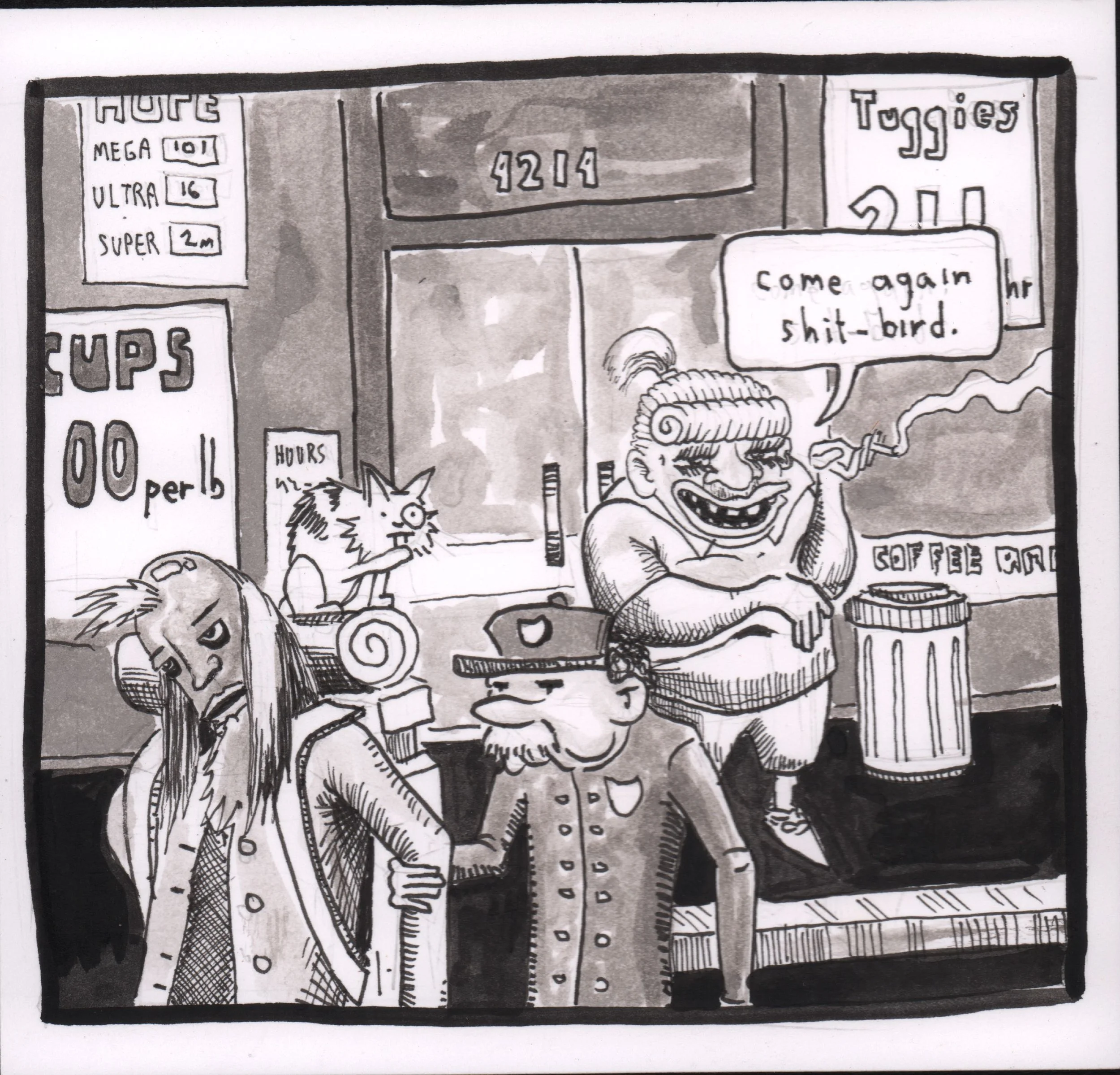 Doing Good was one of the last comics I made with traditional mediums. There are a lot of problems with it. Although I knew where I wanted to take it, I had difficulty getting there. I have since gained a great appreciation for script writing and story boarding and try to resist the urge to start working until I know exactly where I want to take a story. For all its problems this ditty means a lot to me and I hope you enjoy it too.