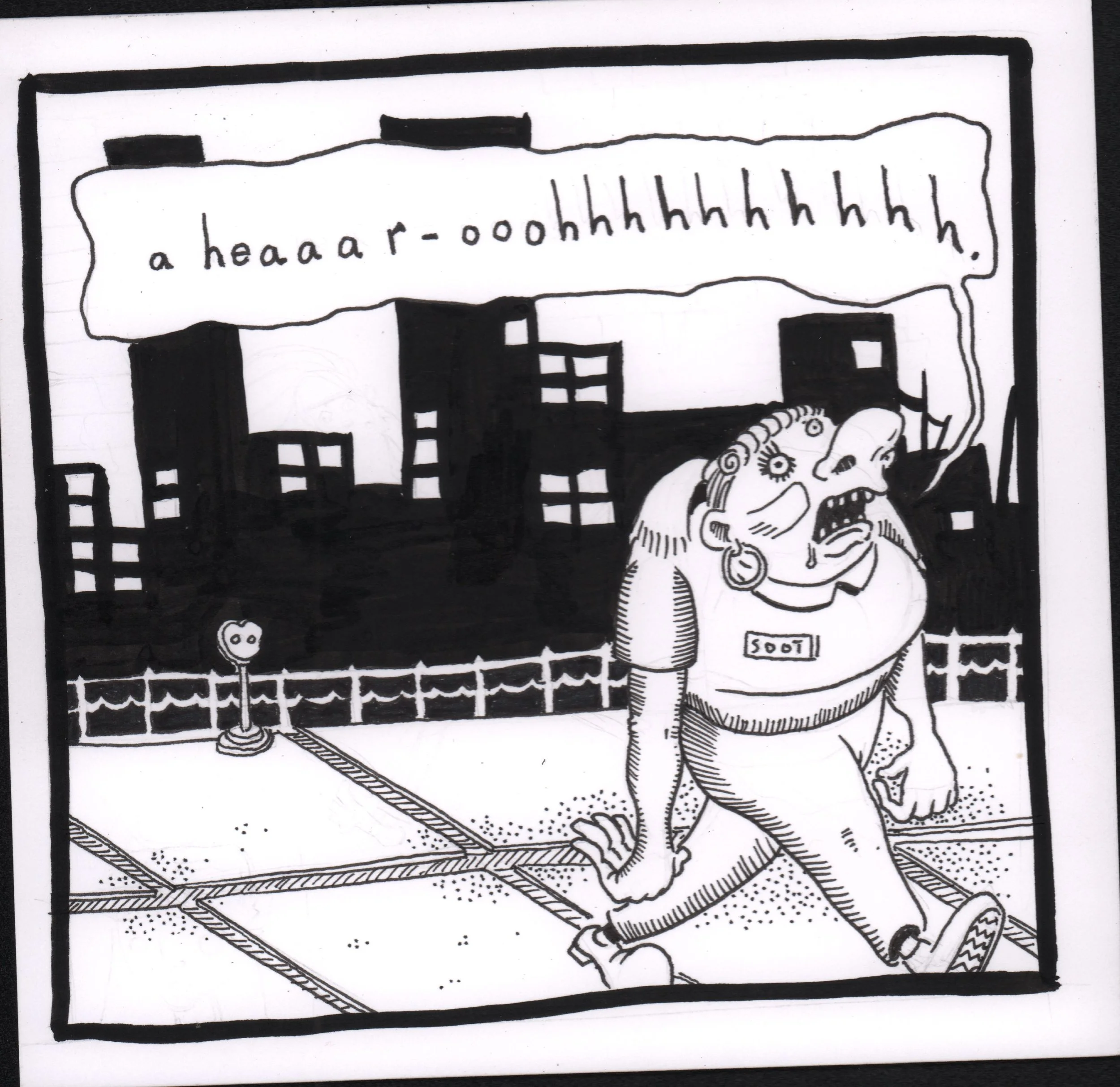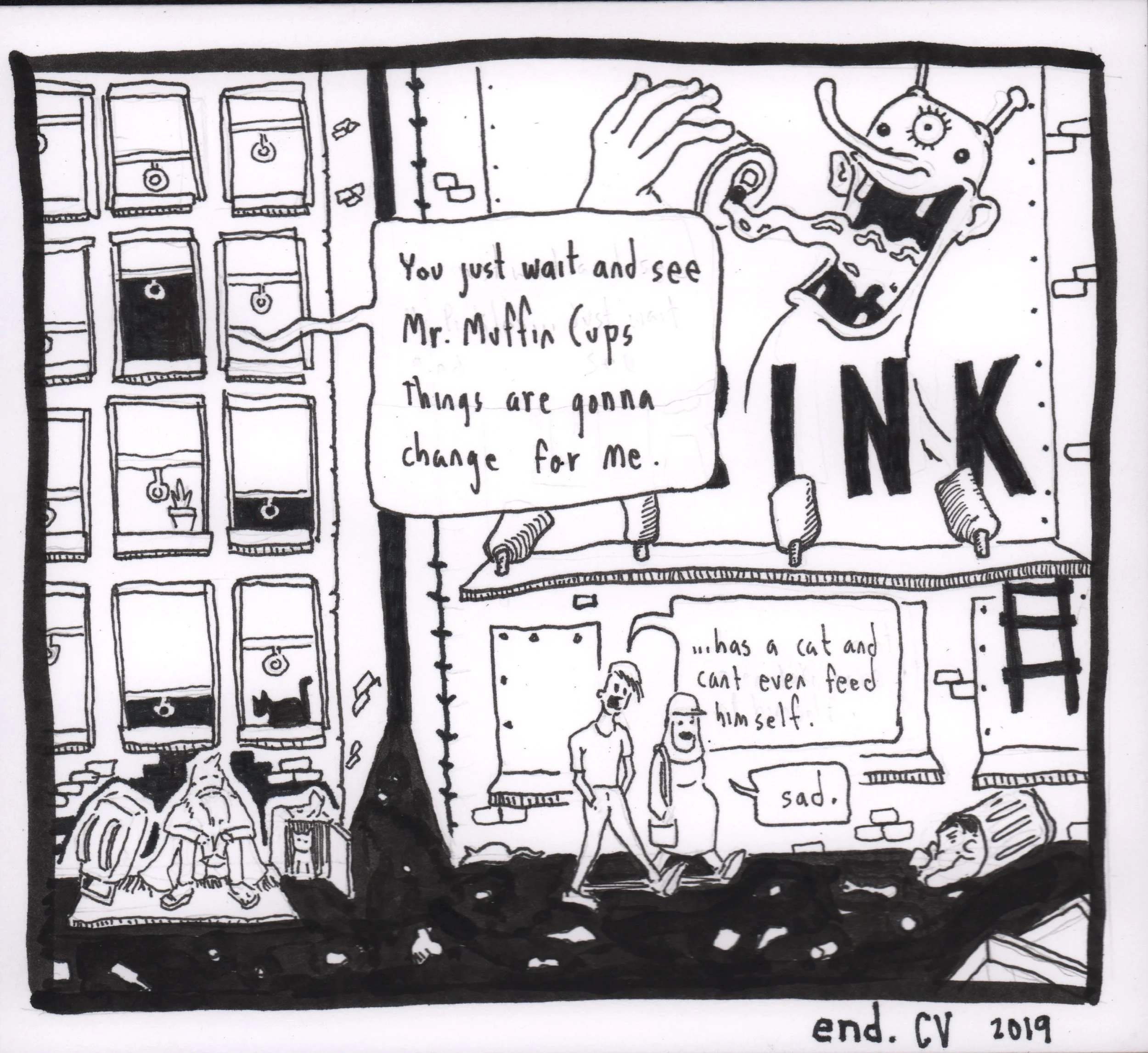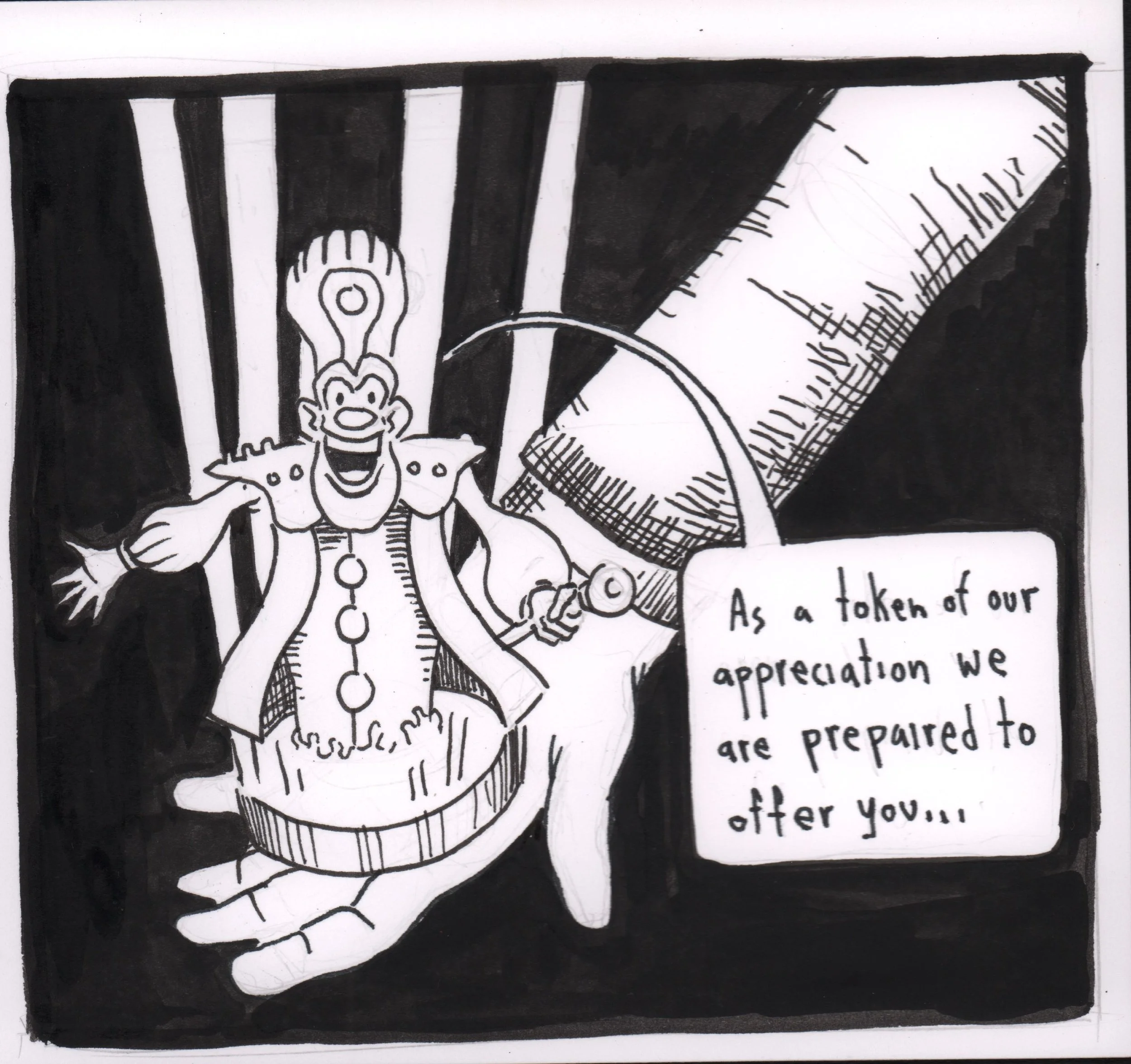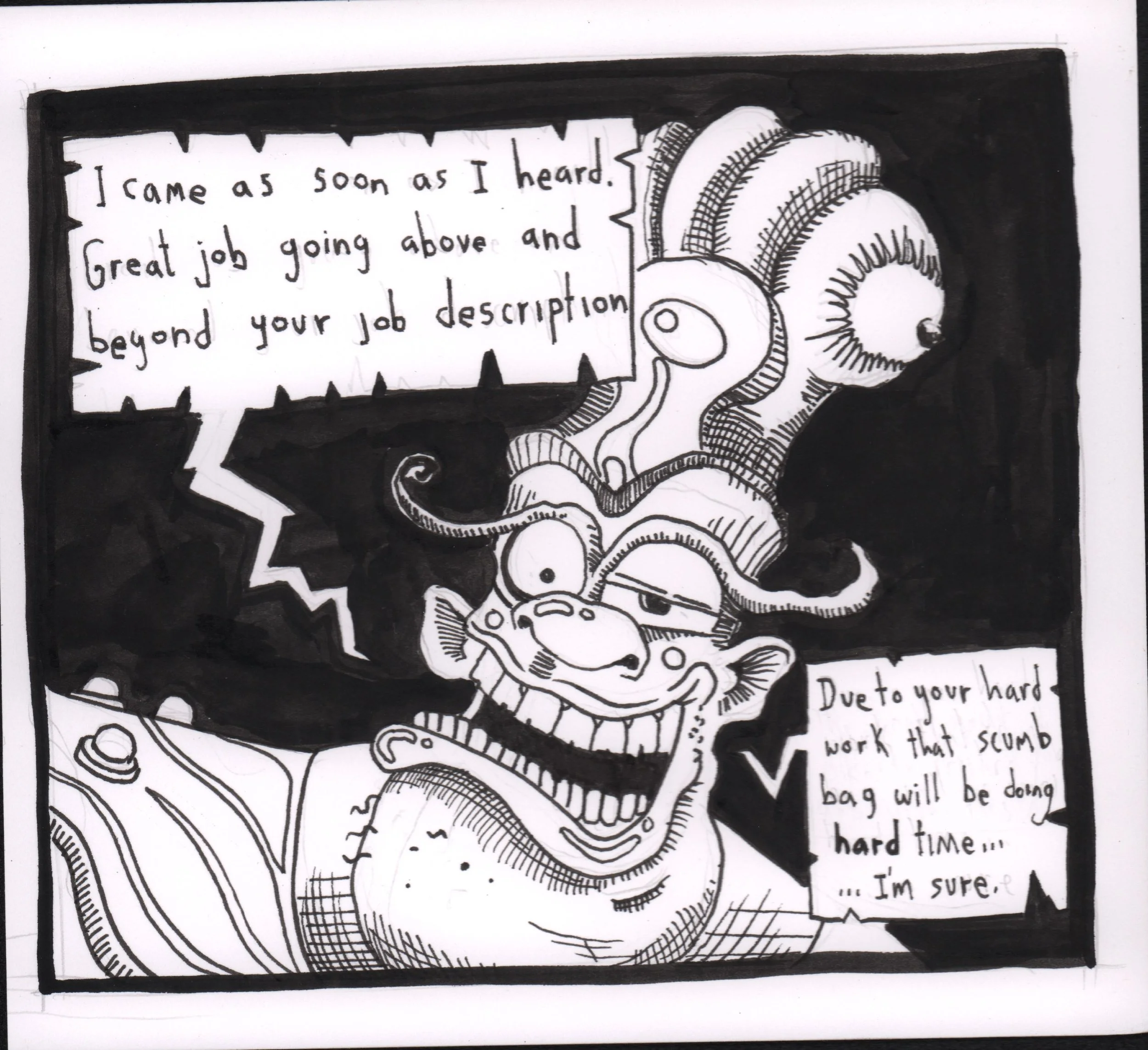 Doing Good was one of the last comics I made with traditional mediums. There are a lot of problems with it. Although I knew where I wanted to take it, I had difficulty getting there. I have since gained a great appreciation for script writing and story boarding and try to resist the urge to start working until I know exactly where I want to take a story. For all its problems this ditty means a lot to me and I hope you enjoy it too.